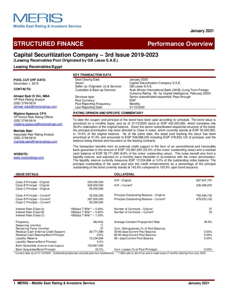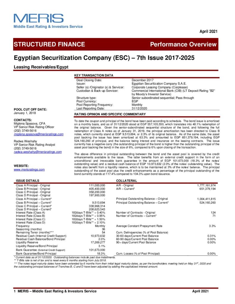 The Egyptian Securitization Company – 7th Issue Class A “AA+”(sf) Class B “AA”(sf) Class C “AA-“(sf) Class D “A”(sf)